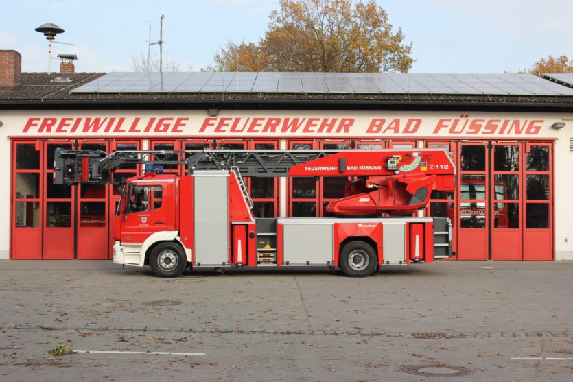 DLK 23/12 Funkrufname Florian Bad Füssing 30/1 Besatzung 1/2 Fahrgestell Mercedes Benz 1530 Atego zulässiges Gesamtgewicht 15.500 kg Leistung: 220 KW (300 PS) Maße (L x B x H): 10.310…